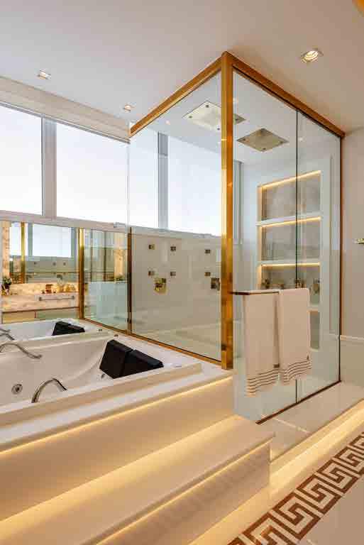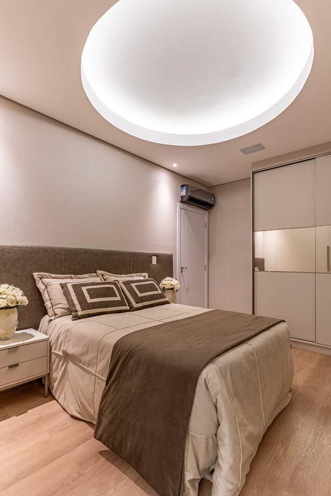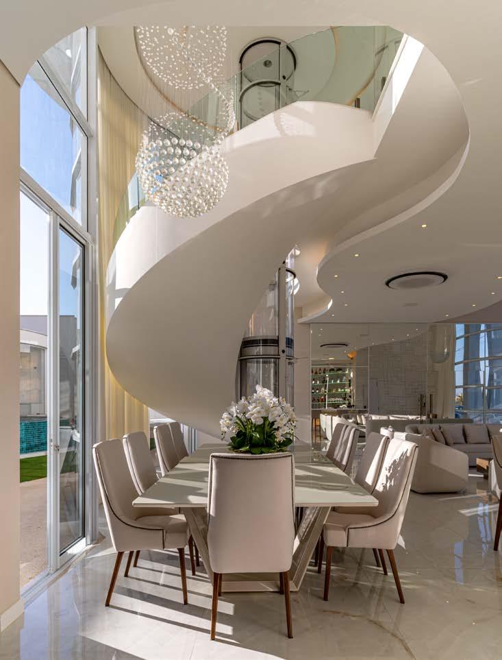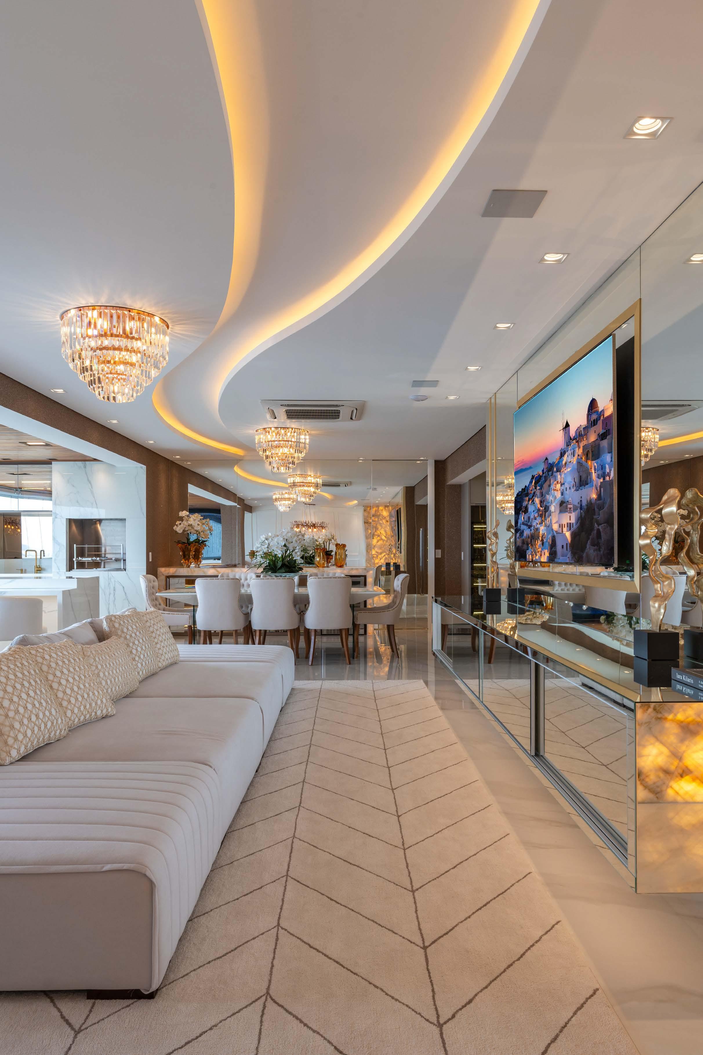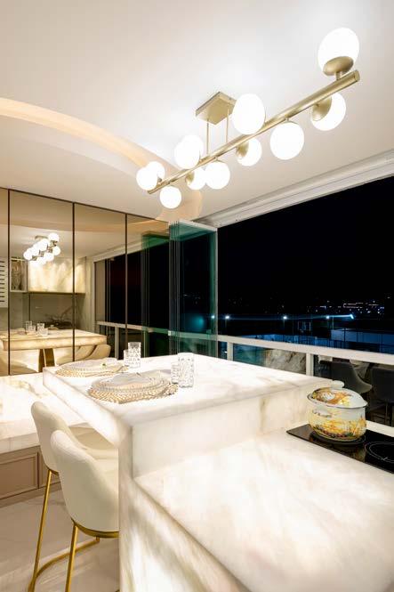 A integração dos ambientes sociais, torna tudo mais amplo. O living com lareira, é composto por um grande sofá com linhas curvas “Kílaris”, o que concebe movimento e beleza ao espaço. Painéis em madeira com esculturas trazem acolhimento. A decoração moderna ganhou pitadas de elementos clássicos, como a grande mesa de jantar espelhada. A cozinha gourmet é completa e conta com balcão de refeições e até churrasqueira. Uma sala multiuso, usada como escritório ou descanso é responsável pela transição da área social para a área íntima das três suítes. A máster, toda branca e dourada é elegante e conta até com uma saleta particular, onde é possível tomar café ou trabalhar.