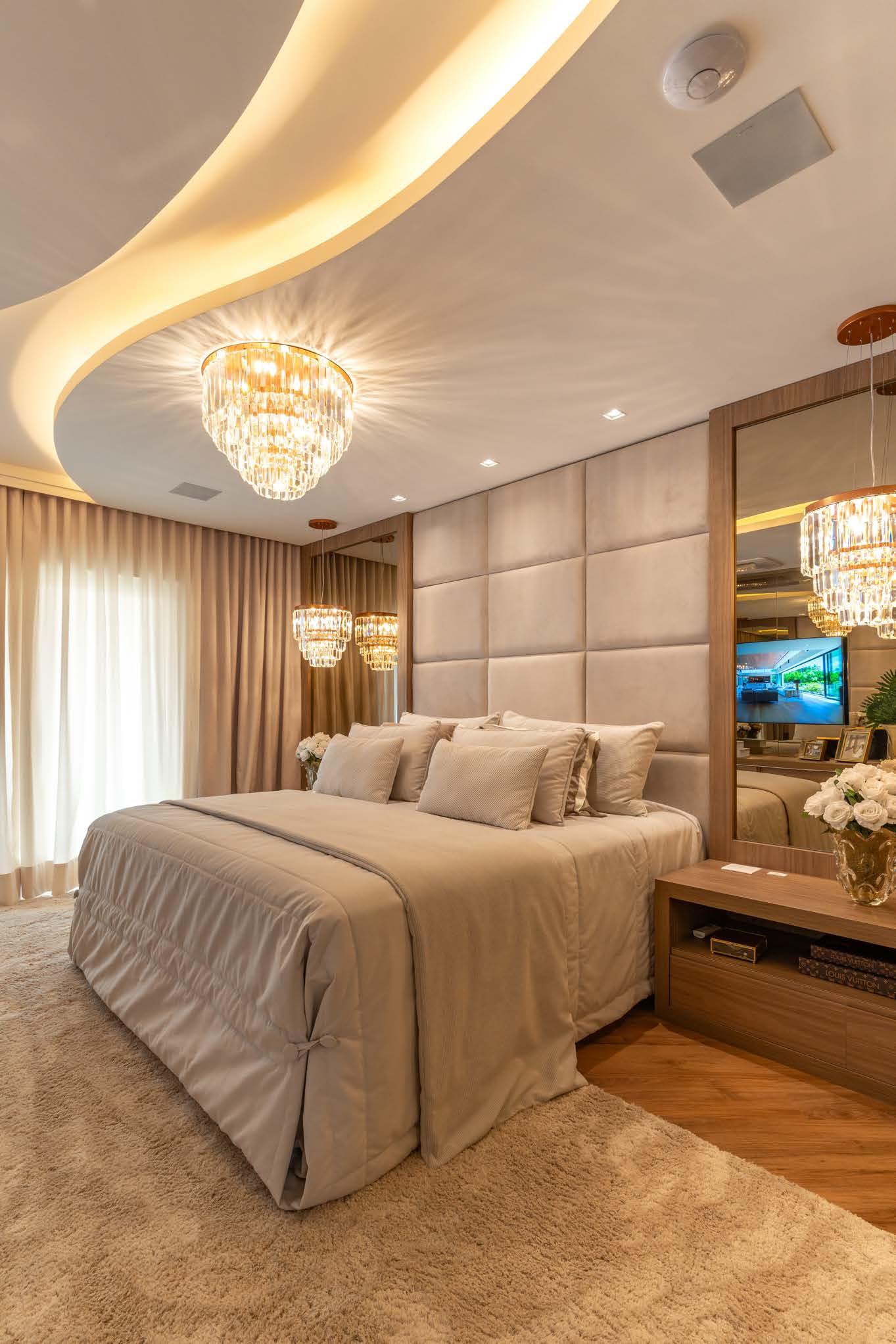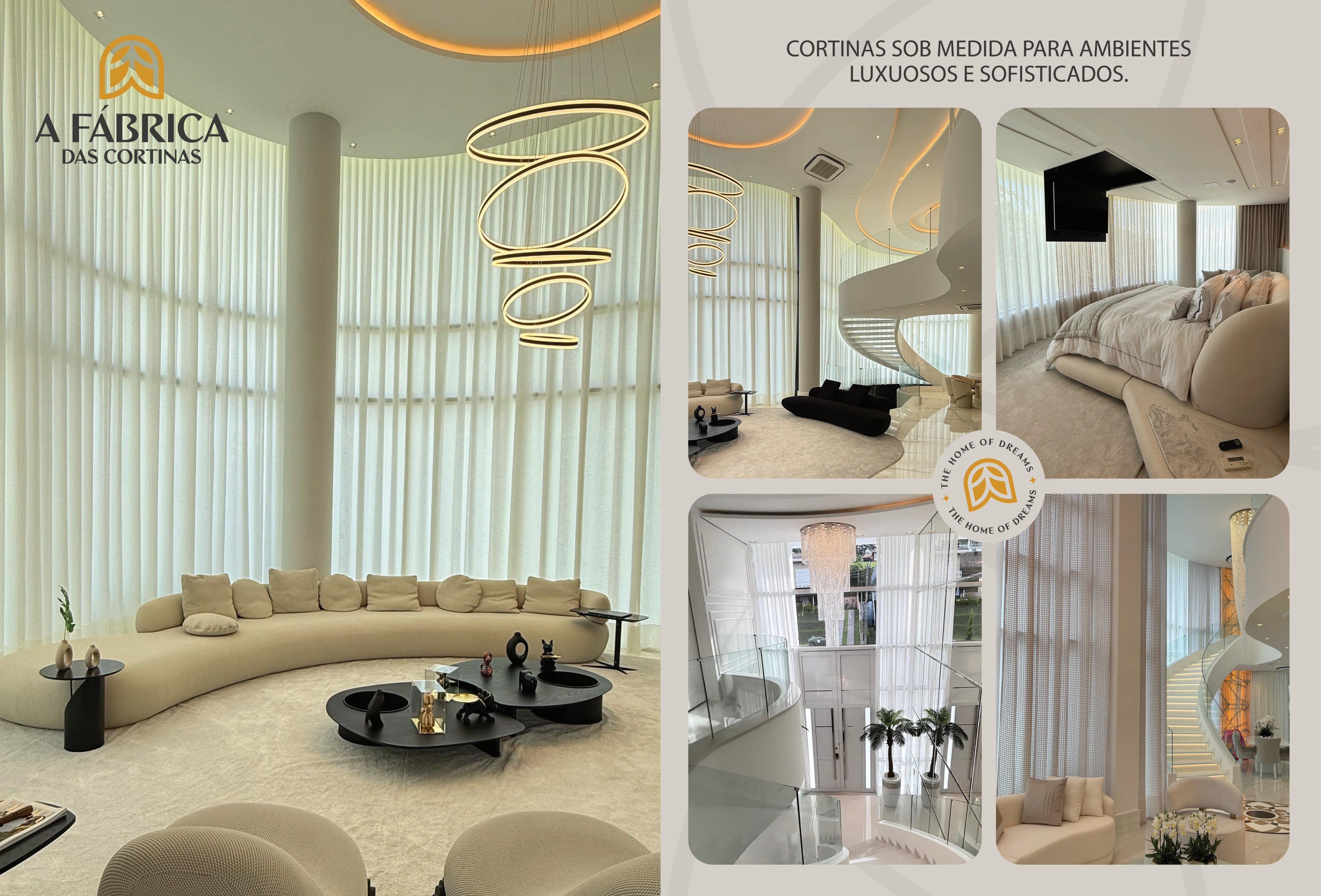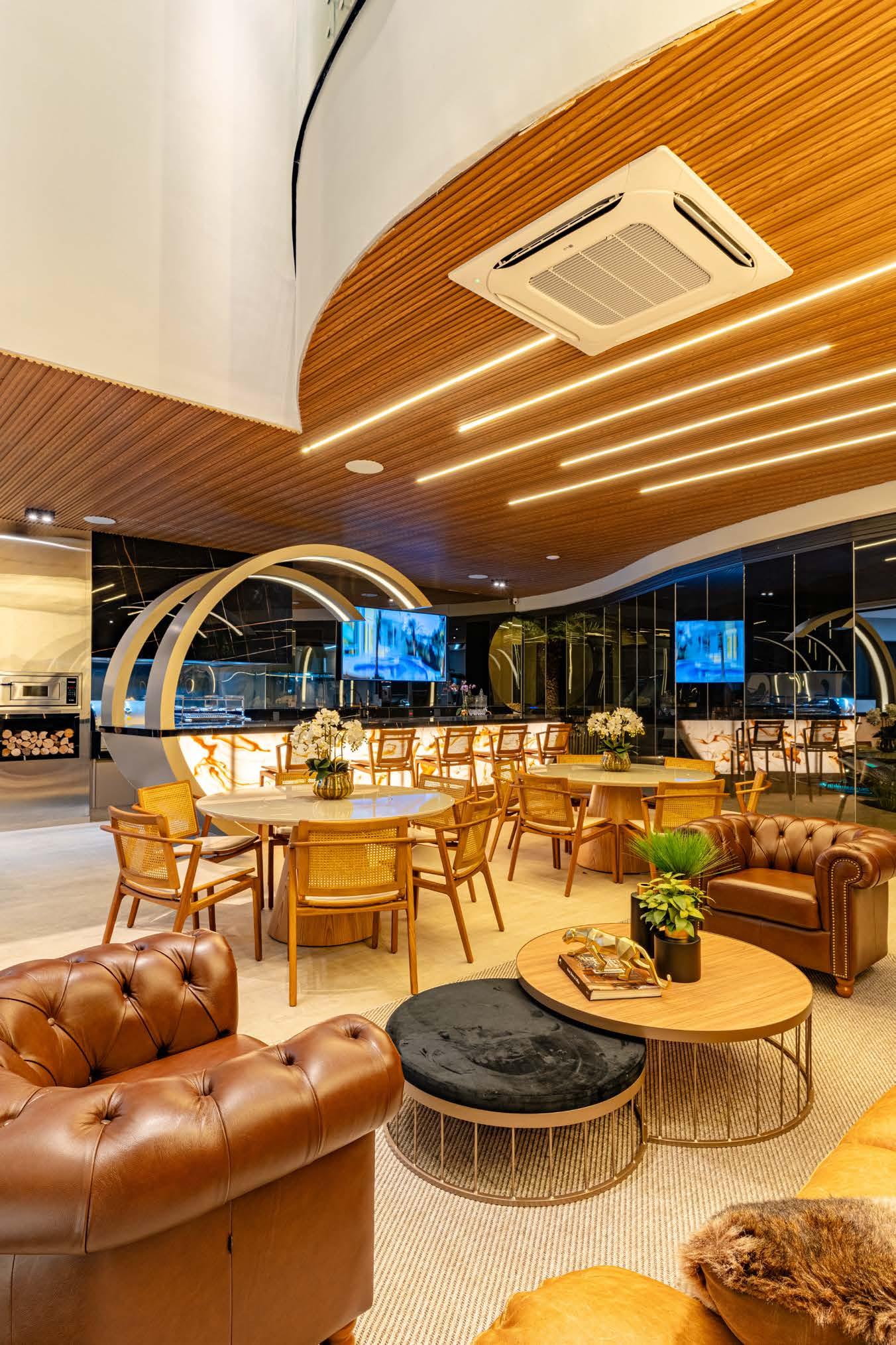 A integração dos ambientes sociais, torna tudo mais amplo. O living com lareira, é composto por um grande sofá com linhas curvas “Kílaris”, o que concebe movimento e beleza ao espaço. Painéis em madeira com esculturas trazem acolhimento. A decoração moderna ganhou pitadas de elementos clássicos, como a grande mesa de jantar espelhada. A cozinha gourmet é completa e conta com balcão de refeições e até churrasqueira. Uma sala multiuso, usada como escritório ou descanso é responsável pela transição da área social para a área íntima das três suítes. A máster, toda branca e dourada é elegante e conta até com uma saleta particular, onde é possível tomar café ou trabalhar.