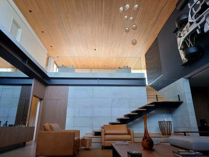 O gourmet completo, com fogão, churrasqueira, mesa e bancada de refeições, ganhou ainda um spa com cromoterapia, no alto de um deck de madeira e com parede verde. Um painel de espelho separa a área social da área íntima. Nela estão localizadas a sala de cinema, em preto e cinza com projeto luminotécnico diferenciado e duas suítes, uma para hóspedes e a máster.