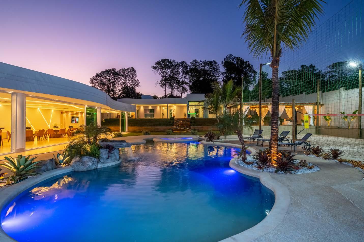 Lazer, diversão e relaxamento. Esses são os conceitos que nortearam o projeto Chácara Paradise, um verdadeiro paraíso cercado pela natureza, no meio da cidade de Limeira. Em um terreno de 1820 m², o arquiteto Aquiles Nícolas Kílaris complementou a casa principal com as curvas e linhas sinuosas características de seu estilo, integrou os ambientes e projetou toda a área de lazer da chácara.