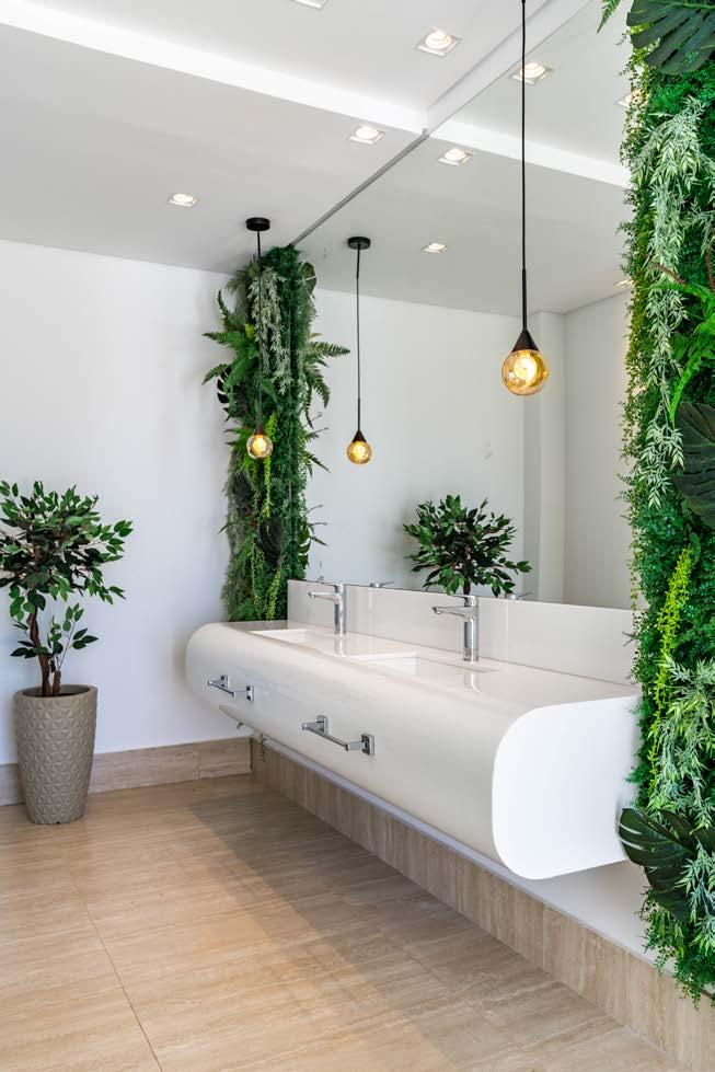Nesta concepção, a entrada da residência ganhou ainda um pilar escultural, acompanhando a altura da porta de pé direito duplo. Seu desenho remete a forma de um olho, com uma cascata instalada ao centro, que deságua em um espelho d’água.