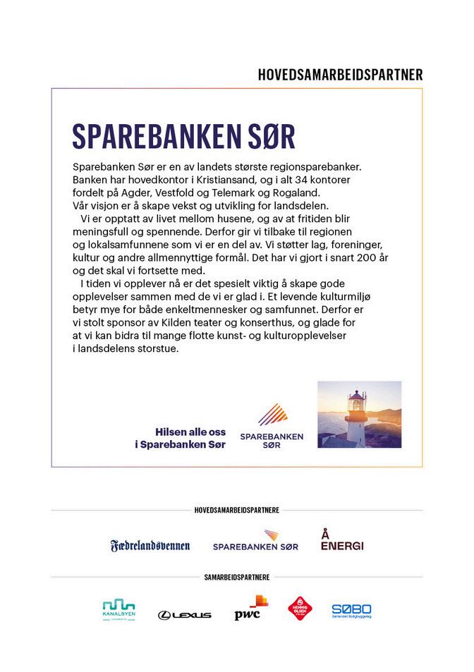 Velkommen til konsert og sesongåpning med Kristiansand Symfoniorkester. Vi er stolte av programmet i månedene fremover, og jeg er overbevist om at vi har mange fanastiske øyeblikk å se frem til kommende sesong.Orkesteret er i vinden for tiden, og det er veldig inspirerende for oss at publikum møter opp som dere gjør