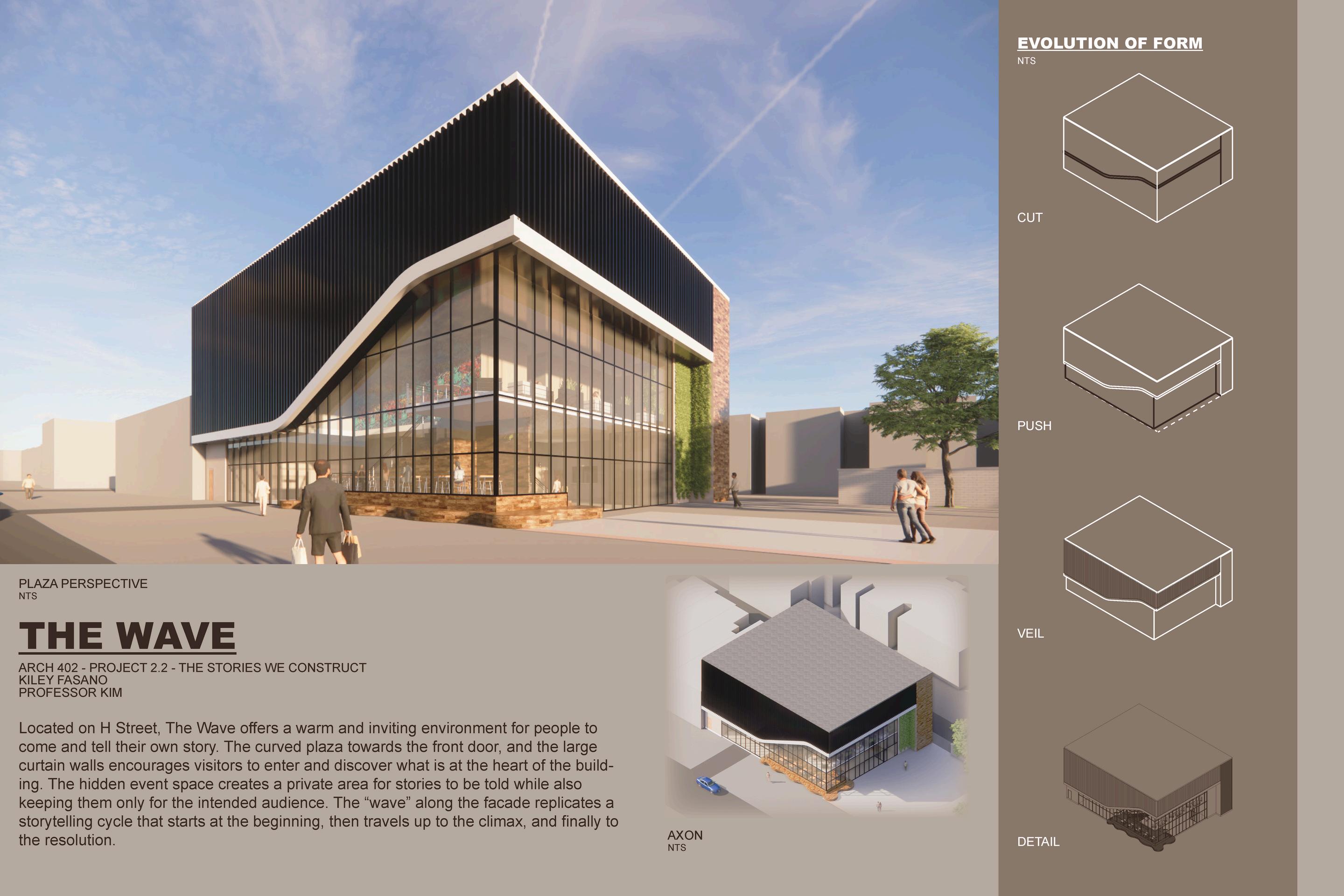 Located on H Street, The Wave offers a warm and inviting environment for people to come and tell their own story. The curved plaza towards the front door, and the large curtain walls encourages visitors to enter and discover what is at the heart of the building. The hidden event space creates a private area for stories to be told while also keeping them only for the intended audience. The “wave” along the facade replicates a storytelling cycle that starts at the beginning, then travels up to the climax, and finally to the resolution.