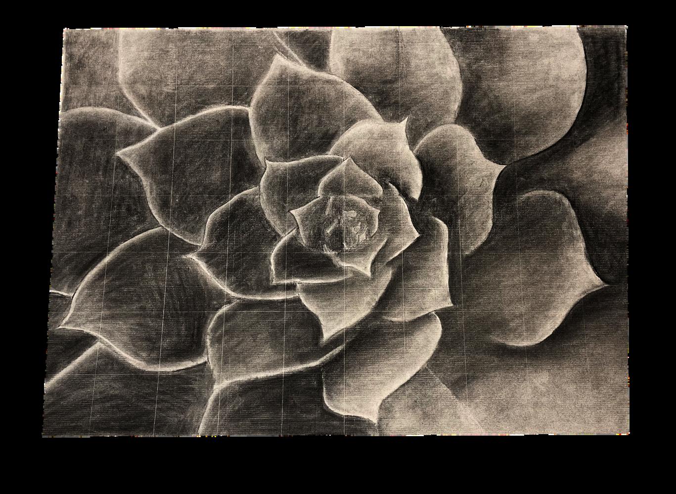 The top still life was designed by looking at a piece of white cloth that was hung on the wall with a light shining on it. The task of this piece was to acknowledge and understand where the highlights and shadows were in order to make this drawing look more realistic. The drawing on the bottom was created around understanding proportions. Students were given an image of this flowers with a grid laid overtop. Then, students had to follow the image within each grid square and draw them at a bigger scale.