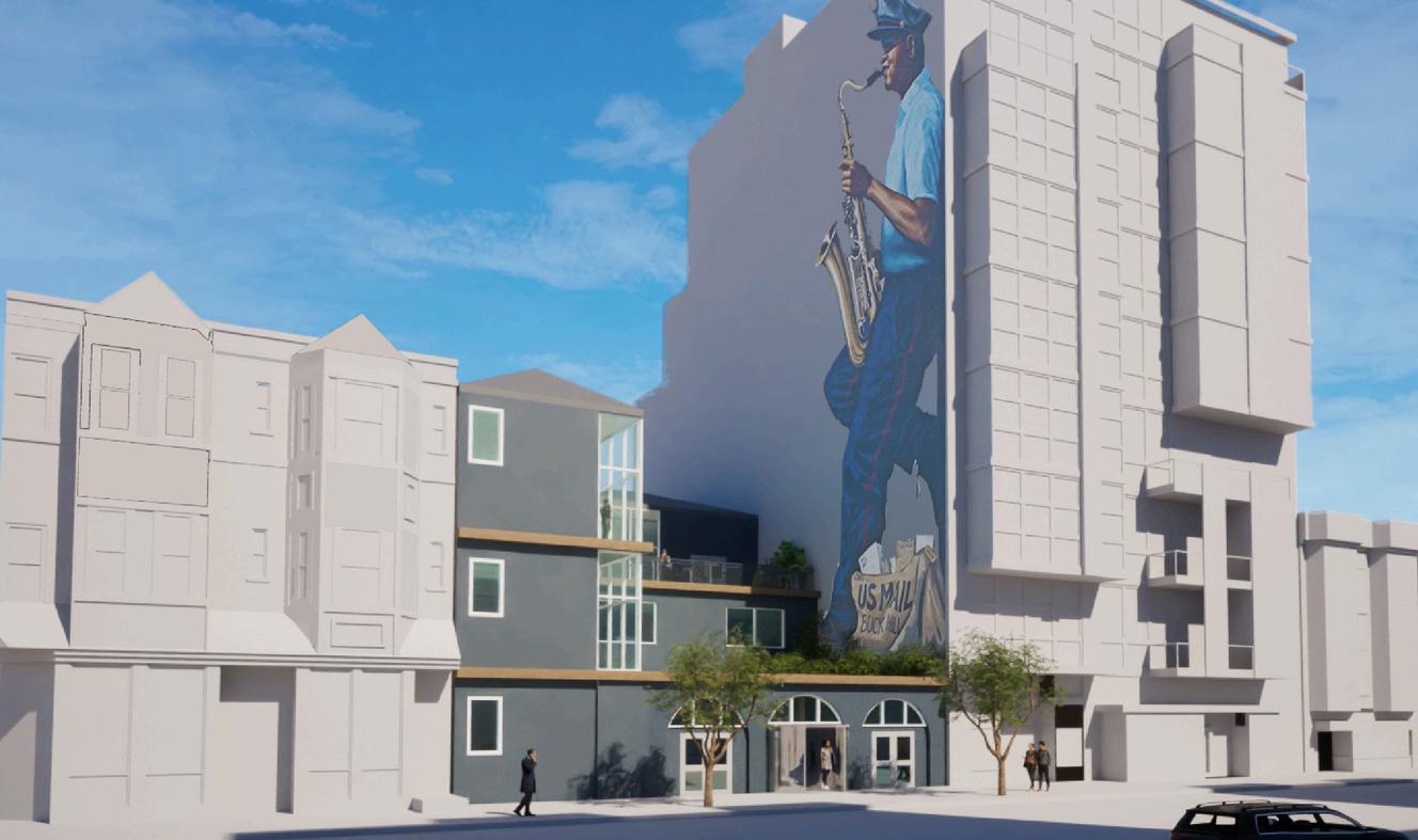 Back in 2018, nine-story mural was constructed. The inspiration for the new street art came from the story of a local mailman named Buck Hill. Not only did he work in the postal service, but he also preformed jazz music in the area, which was once known as “Black Broadway”. Switching careers leads to his nickname “The Wailin’ Mailman”. This building is meant to showcase and remember Buck Hill for the impact on his community and local jazz music.