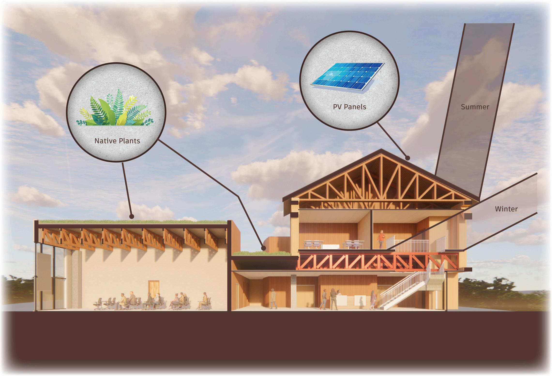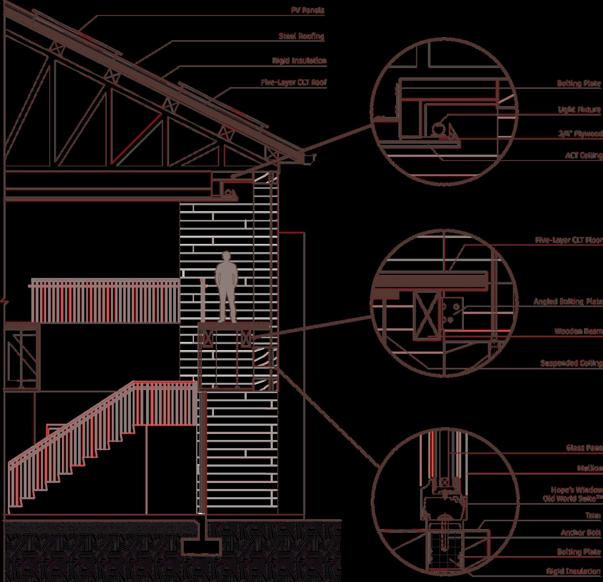 During the Battle of Monocacy, the “Covered Bridge” over the Monocacy River was the fastest route for the Confederate soldiers to reach Washington, D.C. The Union Soldiers burned the bridge down to delay the Confederates. “Crossing Point” pays tribute to this significant piece of history while tying in the architectural concept of traditional bridge structures. The building's program was designed for circulation to follow the attributes of free-flowing water, like a river, which can not be fully contained in one direction, but can be guided. This building bridges the past, present, and future, where education flows freely and leads to boundless possibilities.