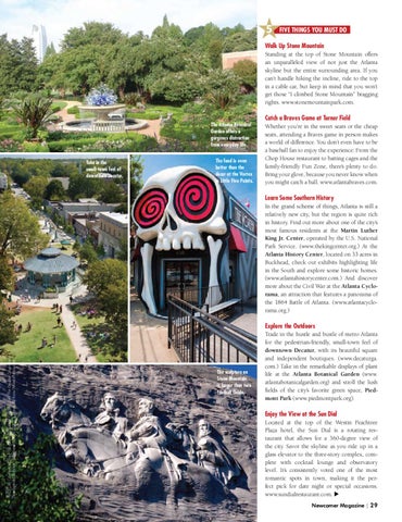 Trade in the hustle and bustle of metro Atlanta for the pedestrian-friendly, small-town feel of downtown Decatur, with its beautiful square and independent boutiques. (www.decaturga. com.) Take in the remarkable displays of plant life at the Atlanta Botanical Garden (www. atlantabotanicalgarden.org) and stroll the lush fields of the city’s favorite green space, Piedmont Park (www.piedmontpark.org).
