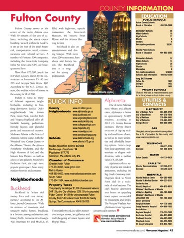 One of metro Atlanta’s most vibrant and affluent cities, Alpharetta is home to approximately 62,000 residents, according to 2012 U.S. Census Bureau estimates. They're drawn to its mix of big-city vitality and small-town charm, as well as its many amenities and affordable housing options. Homes range Median household income: $57,664 from large apartment comMedian age of residents: 34 munities to elegant subPopulation: 977,773 Sales tax: 7%, Atlanta City: 8% divisions, with a median value of $324,300. Chamber of Commerce Alpharetta offers a vaGreater North Fulton riety of parks and outdoor 770-993-8806, www.gnfcc.com Metro Atlanta attractions, including the 404-880-9000, www.metroatlantachamber.com Big Creek Greenway trail. South Fulton Shoppers flock to North 770-964-1984, www.southfultonchamber.com Point Mall for a multiProperty Taxes tude of retail options. The The property tax rate per $1,000 of assessed value is: city’s historic downtown $44.12 for the City of Atlanta; $29.13 for incorporated area boasts an appealing Fulton County; $41.60 for unincorporated Fulton town square surrounded County; $33.75 for Johns Creek; $33.86 for Sandy by restaurants and shops. Springs. Tax Commissioner: 404-613-6100 The Verizon Wireless Amphitheatre hosts big-name The neighborhood also offers numerconcerts each summer. N ous antique stores, art galleries and For more counties and neighborhood mall shopping at Lenox Square and information, visit our Web site at www.newcomeratlanta.com Phipps Plaza..