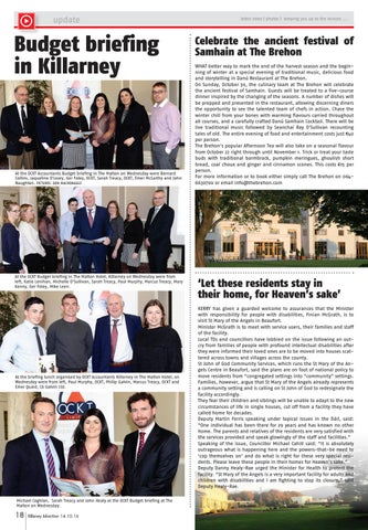 ‘Let these residents stay in their home, for Heaven’s sake’ KERRY has given a guarded welcome to assurances that the Minister with responsibility for people with disabilities, Finian McGrath, is to visit St Mary of the Angels in Beaufort. Minister McGrath is to meet with service users, their families and staff of the facility. Local TDs and councillors have lobbied on the issue following an outcry from families of people with profound intellectual disabilities after they were informed their loved ones are to be moved into houses scattered across towns and villages across the county. St John of God Community Services, which runs the St Mary of the Angels Centre in Beaufort, said the plans are on foot of national policy to move residents from “congregated settings into “community” settings. Families, however, argue that St Mary of the Angels already represents a community setting and is calling on St John of God to redesignate the facility accordingly. They fear their children and siblings will be unable to adapt to the new circumstances of life in single houses, cut off from a facility they have called home for decades. Deputy Martin Ferris speaking under topical issues in the Dáil, said: “One individual has been there for 29 years and has known no other home. The parents and relatives of the residents are very satisfied with the services provided and speak glowingly of the staff and facilities.” Speaking of the issue, Councillor Michael Cahill said: “It is absolutely outrageous what is happening here and the powers-that-be need to ‘cop themselves on’ and do what is right for these very special residents. Please leave these people in their homes for Heaven’s sake.” Deputy Danny Healy-Rae urged the Minister for Health to protect the facility. “St Mary of the Angels is a very important facility for adults and children with disabilities and I am fighting to stop its closure,” said Deputy Healy-Rae.