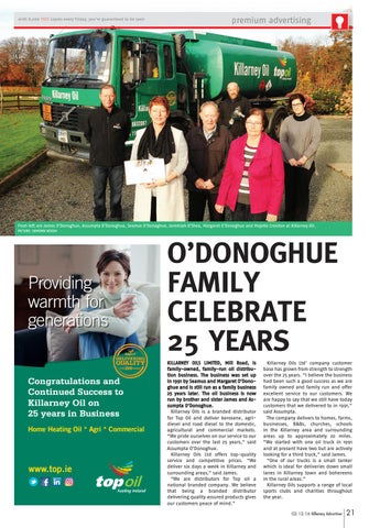 O’DONOGHUE FAMILY CELEBRATE 25 YEARS KILLARNEY OILS LIMITED, Mill Road, is family-owned, family-run oil distribution business. The business was set up in 1991 by Seamus and Margaret O’Donoghue and is still run as a family business 25 years later. The oil business is now run by brother and sister James and Assumpta O’Donoghue. Killarney Oils is a branded distributor for Top Oil and deliver kerosene, agridiesel and road diesel to the domestic, agricultural and commercial markets. “We pride ourselves on our service to our customers over the last 25 years,” said Assumpta O’Donoghue. Killarney Oils Ltd offers top-quality service and competitive prices. “We deliver six days a week in Killarney and surrounding areas,” said James. “We are distributors for Top oil a national branded company. We believe that being a branded distributor delivering quality assured products gives our customers peace of mind.”
