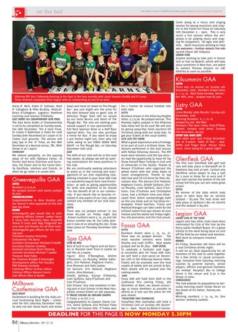 LOTTO Numbers 3,12,13,14 No Jackpot winner next weeks jackpot €7,000 CONGRATULATIONS Congratulations to Aine Murphy and her dancer’s who appeared on the late late toy show BOARD Gneeveguilla gaa would like to wish outgoing officers Eamon Lawlor Denis O Leary Julie McCarthy Dave Mcauliffe Shane O Leary and Mag Fitzgerald the very best and thanks for all their help. Gneeveguilla gaa officers for the coming year President Seamus McCarthy Chairperson Pat Barry Assistant Chairperson Michael O Keeffe Secretary Stephen Crowley Assistant Secretary Denis Fleming Juvenile Secretary Michael T Lawlor Treasure Niall Foley Bar Treasure Bridget O Donoughe Development officer Tim Murphy PRO Thomas Carmody Coaching Officer Cormac Collins Children Officer Noreen Cronin Scór Officer Ellen O Keeffe