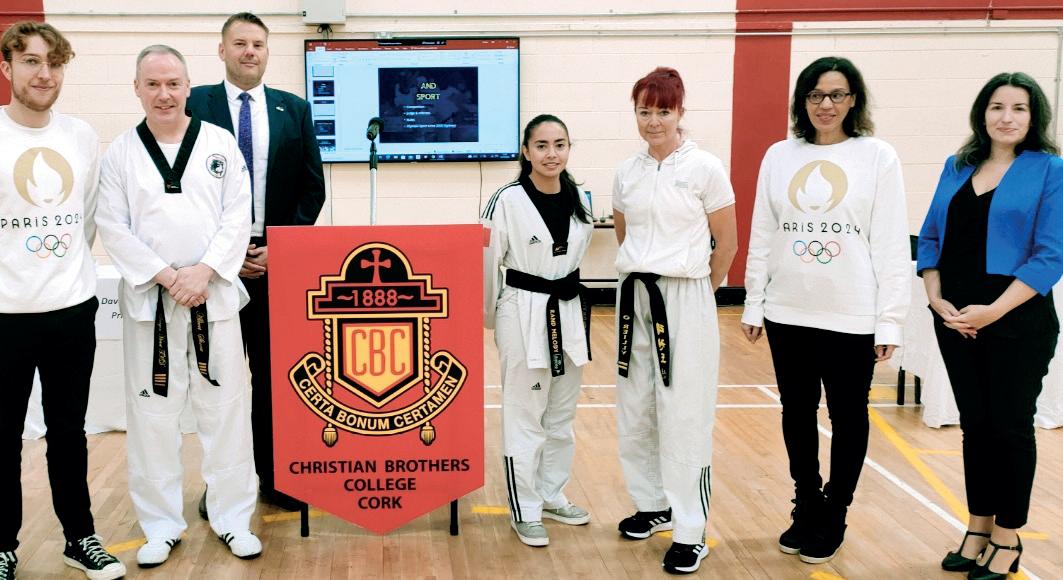 TAEKWONDO: Master Albert Shortt (Killarney, Treasurer of Taekwondo Ireland) with Maura O'Reilly (Kenmare Taekwondo), Melody Rand (French Taekwondo champion) and members of the French Embassy promoting the 2024 Paris Olympics at Christian Brothers College, Cork.