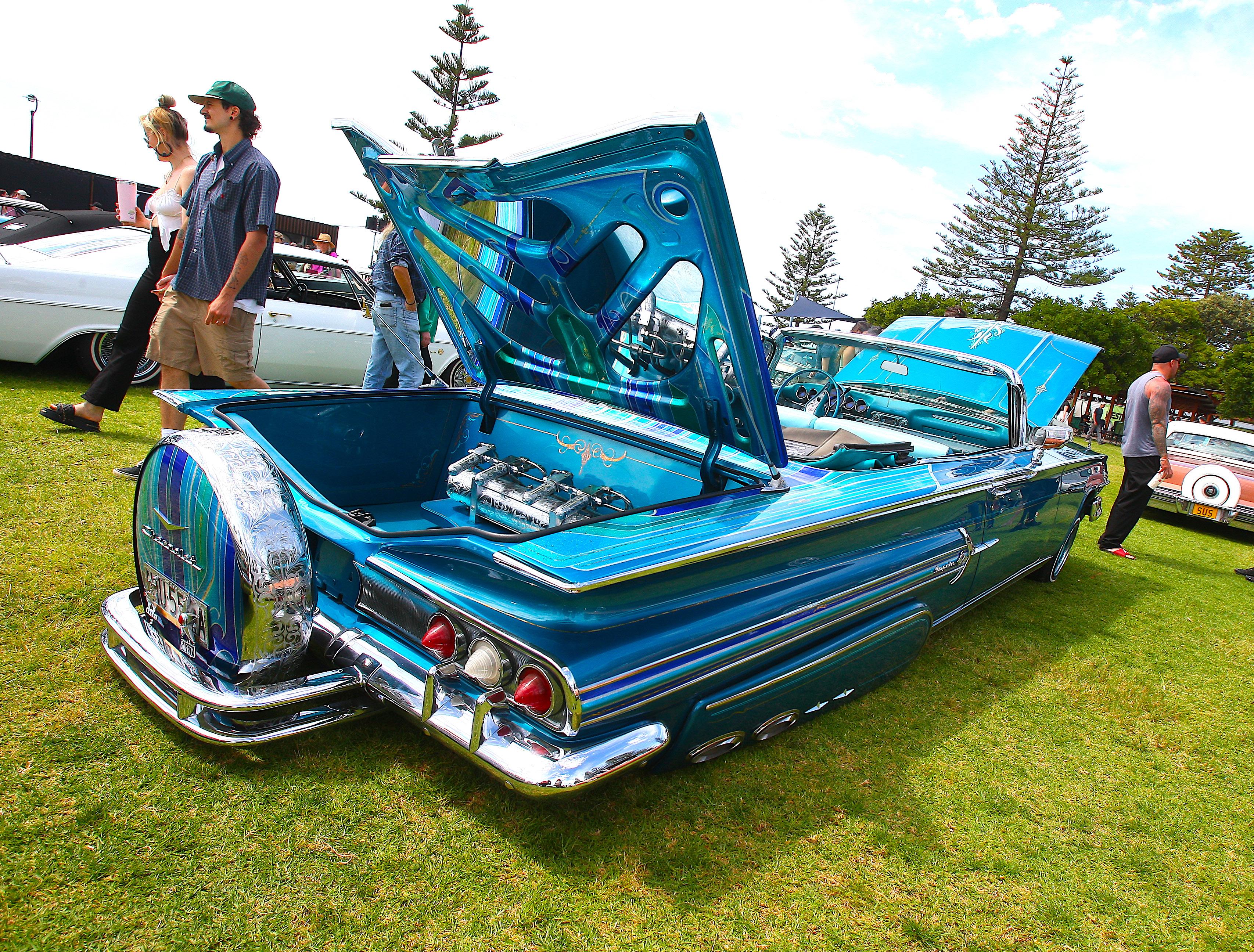 The choice of colours spread across the smooth body, draw you in like a magnet, especially when there’s bright sunshine beaming down across the candy coloured artwork that adorns the Impala’s back half. Even the Continental kit scored the same paint scheme. When combined with the factory base colour, the multi-shades of blue and silver that have been added by Kyle at Smith Concepts take the ’60 to the next level. Closer inspection of the artwork reveals just how intricate the design is, featuring not only a myriad of candies, but also white gold leaf and amazing pinstriping and scroll work. Honestly, you could stare at the Chev’s bodylines all day!