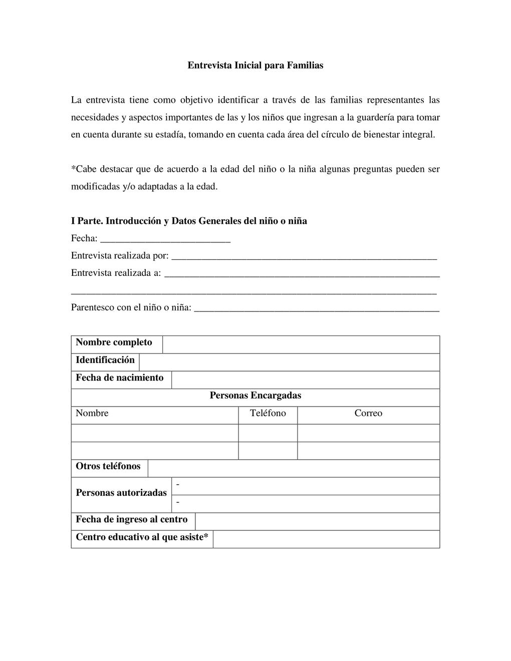 La entrevista tiene como objetivo identificar a través de las familias representantes las necesidades y aspectos importantes de las y los niños que ingresan a la guardería para tomar en cuenta durante su estadía, tomando en cuenta cada área del círculo de bienestar integral.