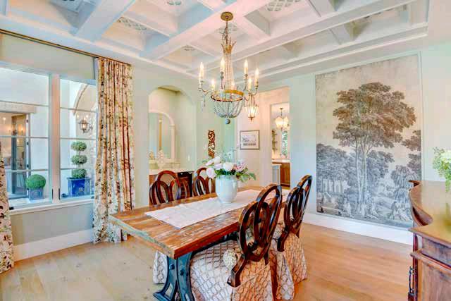 The home’s designer has studied both French design and the way the French have traditionally lived, focusing on the simplicity and symmetry of humble family homes. Spaces are rectangular and logical, but details are found around every corner. Perhaps no room exemplifies that more than the formal dining room, with its inlaid millwork and plaster ceiling panels.