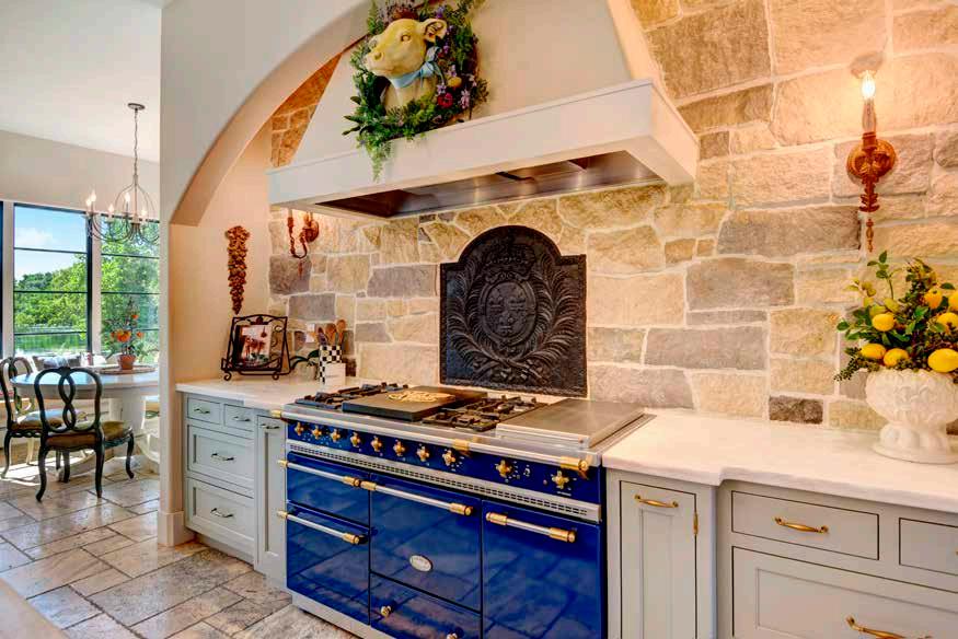 The kitchen is the heart of the home, and the main floor was literally designed around a magnificent blue enamel Lacanche range imported from France and an 18th-century antique cast iron fireback. A large arch enclosing the limestone wall behind the range is