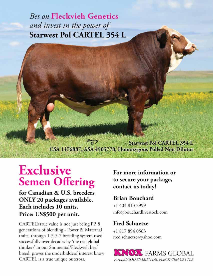 The FSFF continues to reach our fellow breeders through Facebook, Instagram and on our website at Fleckvieh. com. We offer a classified ad page for our members to sell live animals and frozen genetics. Each member receives a 30day free ad listing per year. Additional listings can be set up for a small fee. We also will list sale dates for your farm on our Sales page. You can reach us by email @ Fleckvieh.fsff@gmail.com and watch for our emails for Federation news & announcements.