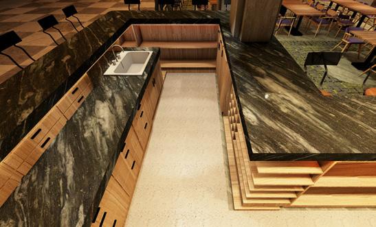 The cafe is a lush oasis of greenery, where the air is alive with the fragrance of fresh food and the buzz of conversation. Earthy materials abound in this natural sanctuary, with detailed stonework wrapping around the space like a comforting embrace. As your eyes roam across the arched recessed shelving that cascades along the west wall, you feel a sense of calm wash over you, carried on the gentle flow of the cafe’s atmosphere, leading you to the inviting bar at the heart of it all