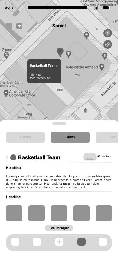 Explore Page : Map of school buildings, clubs, events and shuttle.
