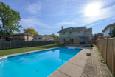 The main floor features a spacious sunken family room with a cozy gas fireplace, a large deck that extends your living space outdoors, and a bright kitchen with stainless steel appliances, tile backsplash, and a contrasting center island. Rich hardwood flooring flows throughout, tying the spaces together. Step outside to your private backyard retreat, complete with a heated pool, pool shed with changing area, and plenty of green space for play and gardening.
