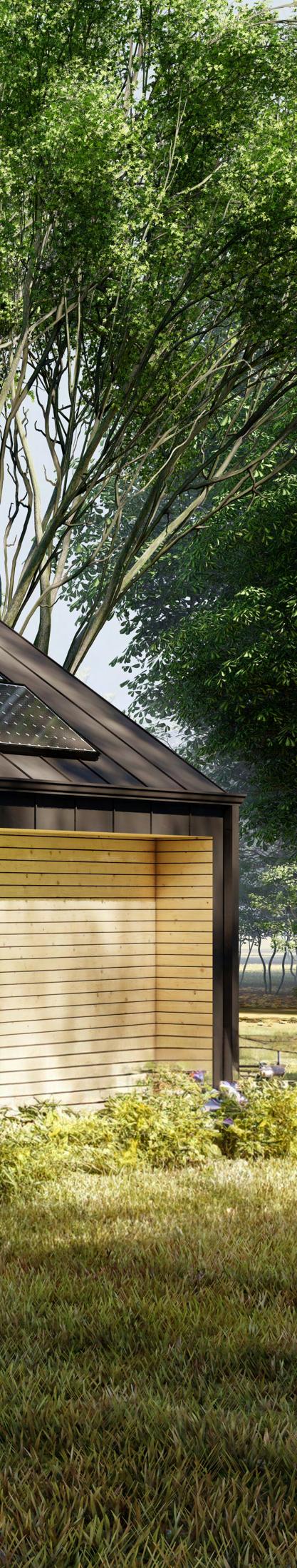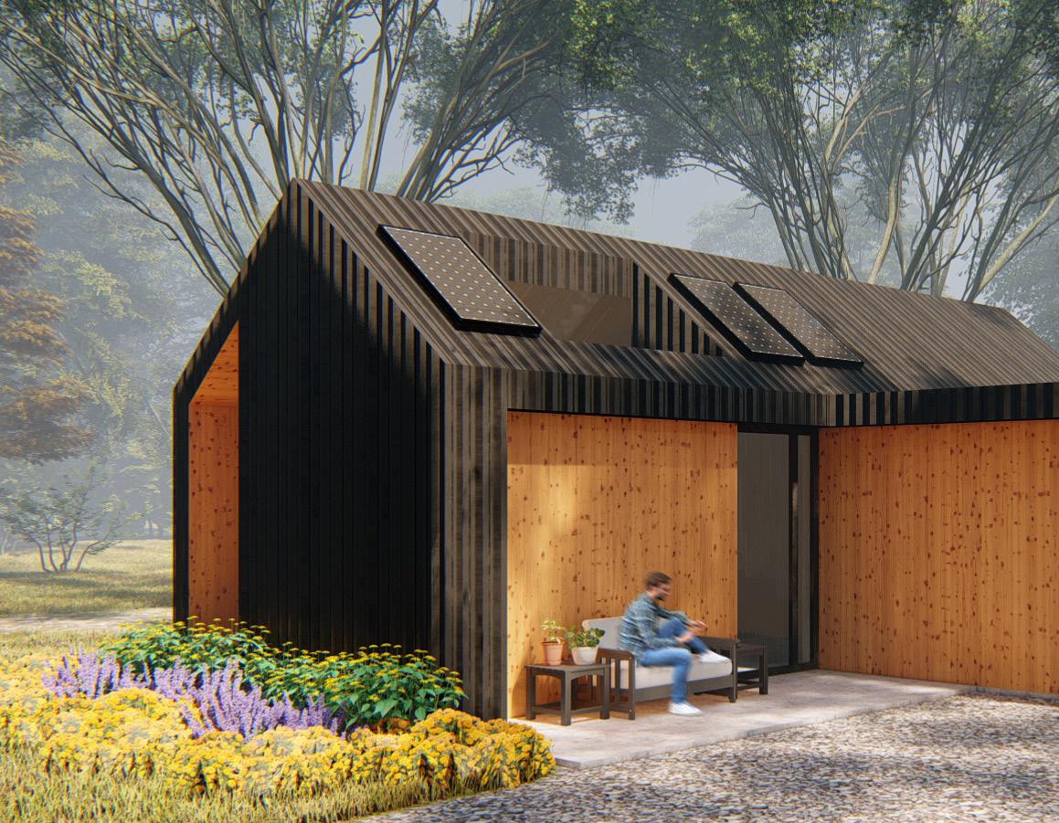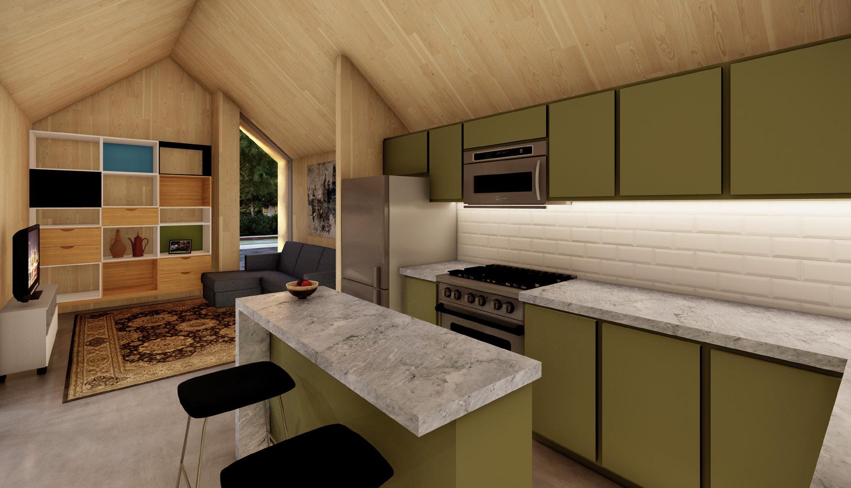 The house was designed to be small yet spacious. It has all of the same amenities that a full-size home would have. All finishes in the home were chosen to be durable so they would aid in the longevity of the home. Solar panels and energyefficient appliances keep the running costs of the house low.