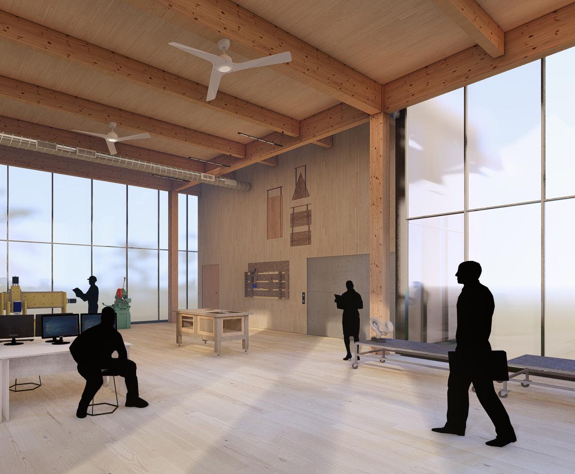 The Glue-Lam elements are mainly in the maker’s spaces. This allows for these areas to have higher ceilings than the residential areas. They also allow for there be a large span between the two structural cores.