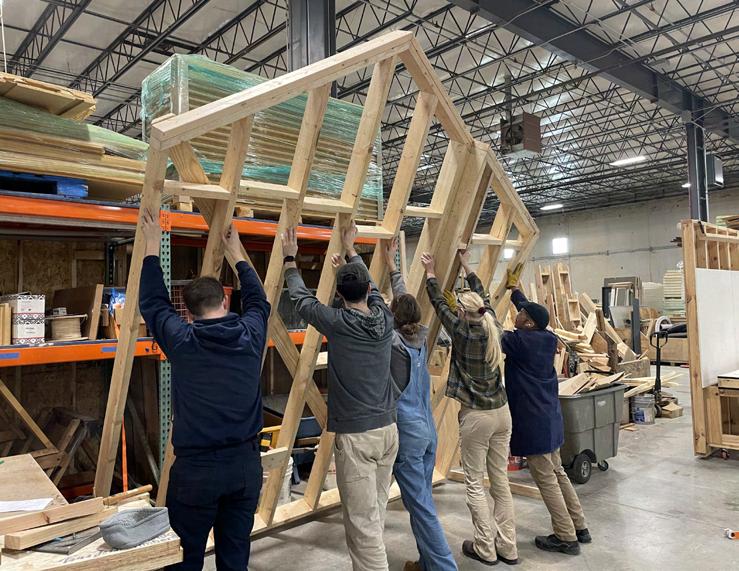 To make things easier for us when we fully started construction, the studio participated in a winter course where we prefabricated part of the house. These pieces included our interior walls, cabinets, and exterior framing. We learned how to operate wood shop machinery and work as a team to get all of these pieces finished.