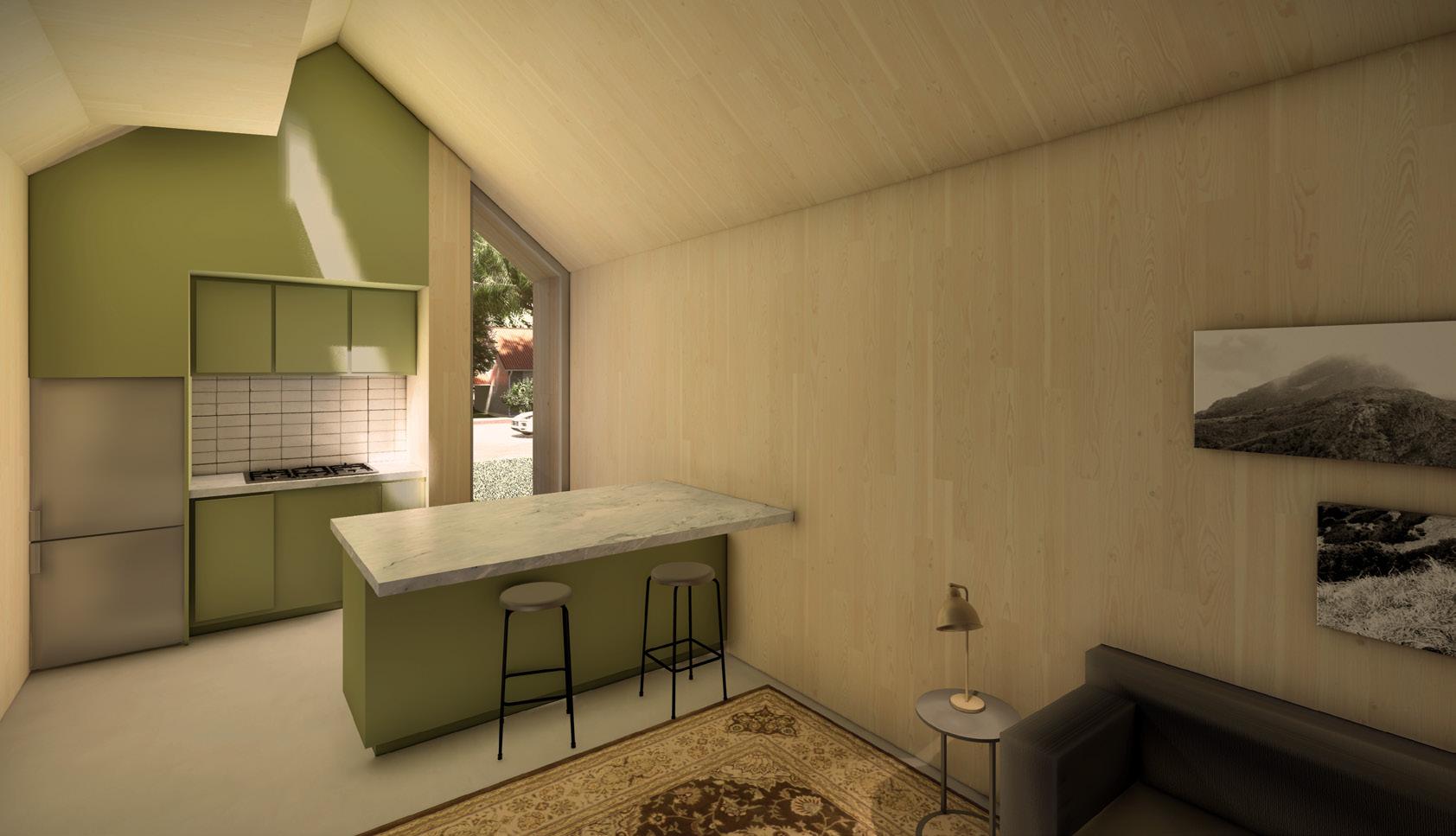Phoenix House is a small, mass timber home design in partnership with Tenants to Homeowners. They are a local organization that uses Kansas Land Trusts to allow people, who wouldn’t normally be able to rent or buy, to own their own homes. This small home is intended to be used as a transitional home that will allow local Kansas residents who are struggling with homelessness to stay in an affordable short-term rental.