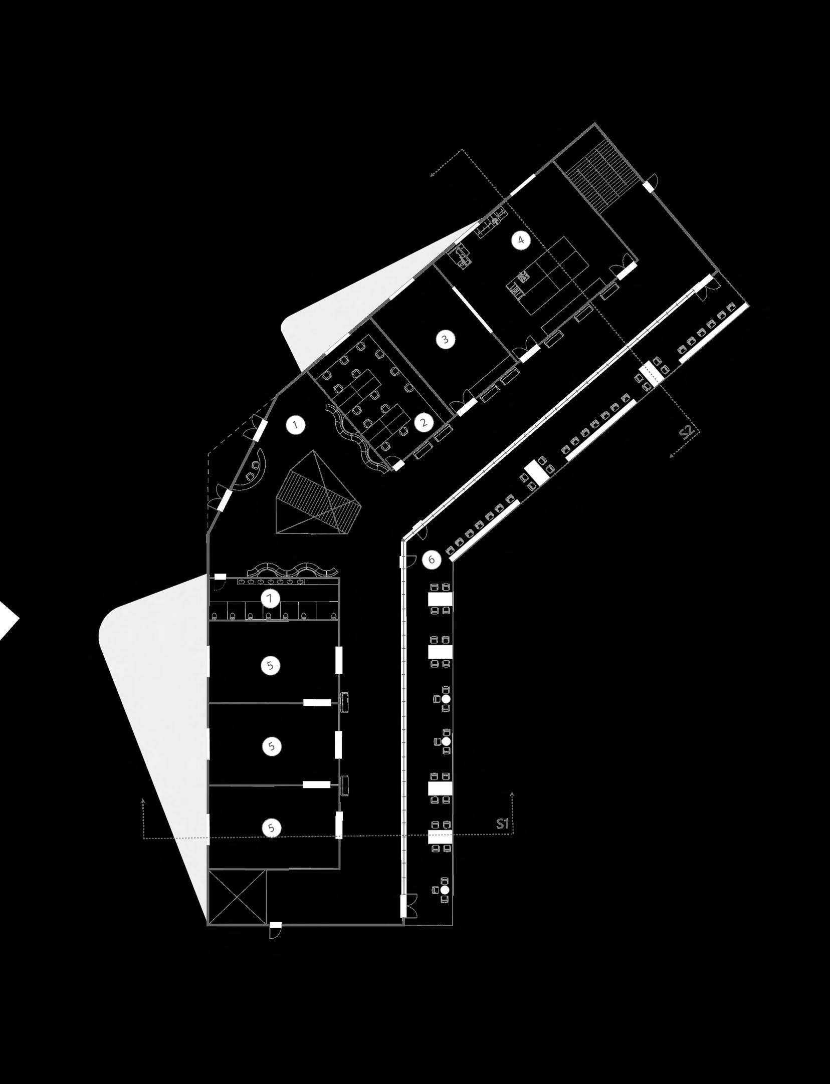 All of the vertical circulation is in the core of the building. This was for structural purposes and to keep most of the spaces equidistant from the elevators.