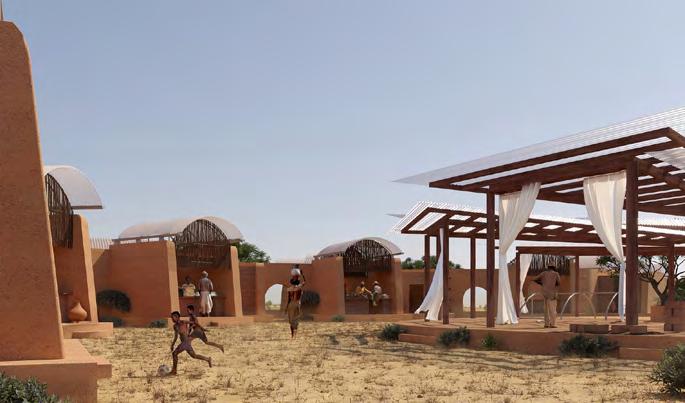 Accessible de l’espace public, le zaure, espace des hommes, s’adosse lui aussi aux murs et lie les habitations entre elles. De plus, les ateliers/ commerces animent la place centrale du village où une halle se construit progressivement avec les habitants. Elle accueillera les différents événements de la communauté : marché, atelier de fabrication, fêtes…