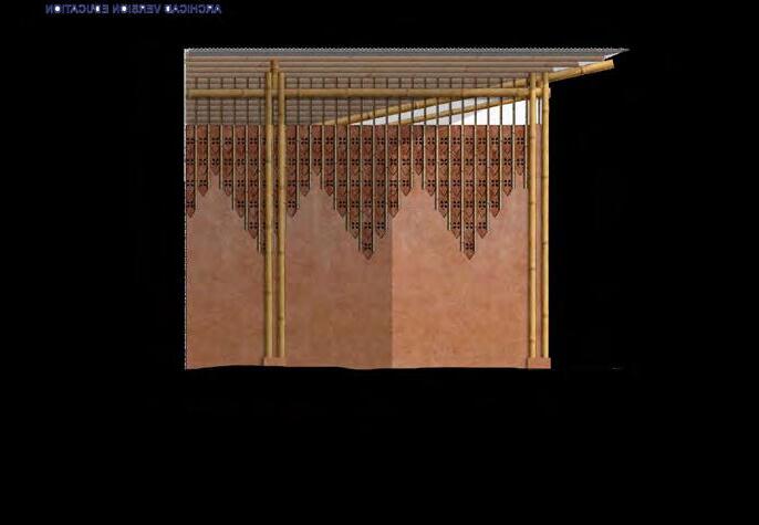 Un jeu de tuiles en terre cuite ajourées rythme les façades. La structure de poteaux-poutres en bambou, de la toiture principale est aussi bien lisible. Une seconde toiture permet de ventiler naturellement ce volume rectiligne. De hautes ouvertures dans chacun des espaces intérieurs complètent ce dispositif.