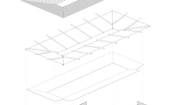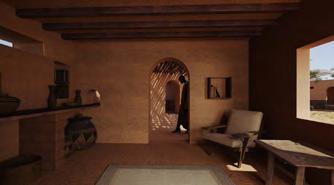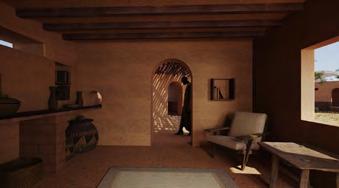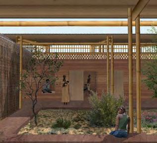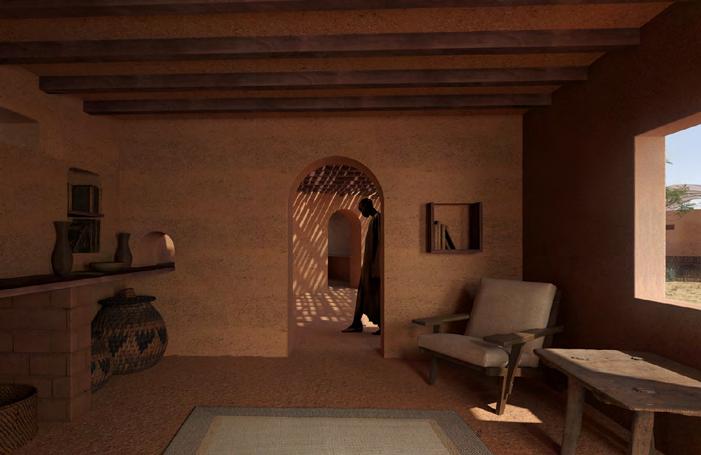 L’idée d’un patio central émerge, tout en longueur. Il s’agit d’un espace extérieur interne à la structure. Il est possible de s’y asseoir dans les alcôves, pour profiter de la fraîcheur. Ce lieu comprend également toutes les circulations, en circuit fermé, couvertes par une avancée de toit. L’orientation de ce dernier permet la récupération de l’eau de pluie, ressource précieuse.