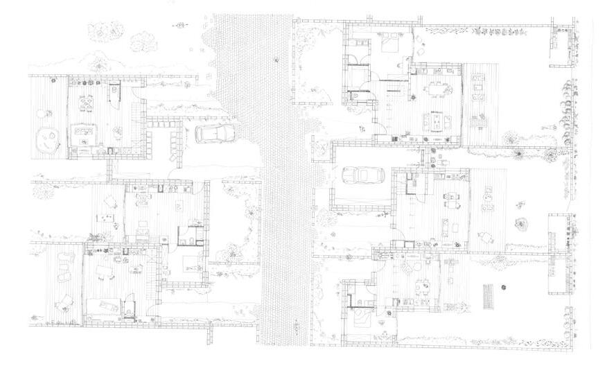 Dans chaque foyer, les différents espaces de vie - du salon extérieur couvert aux espaces humides en passant par la cuisine, les chambres et les patios - s’articulent le long du mur principal en terre. Dans leur continuité, des murs secondaires permettent de récupérer l’eau pluviale des toits, ressource précieuse dans cette région du Nigeria. Entre ces derniers murs, se glissent de fines parois en briques ou de panneaux de branches.