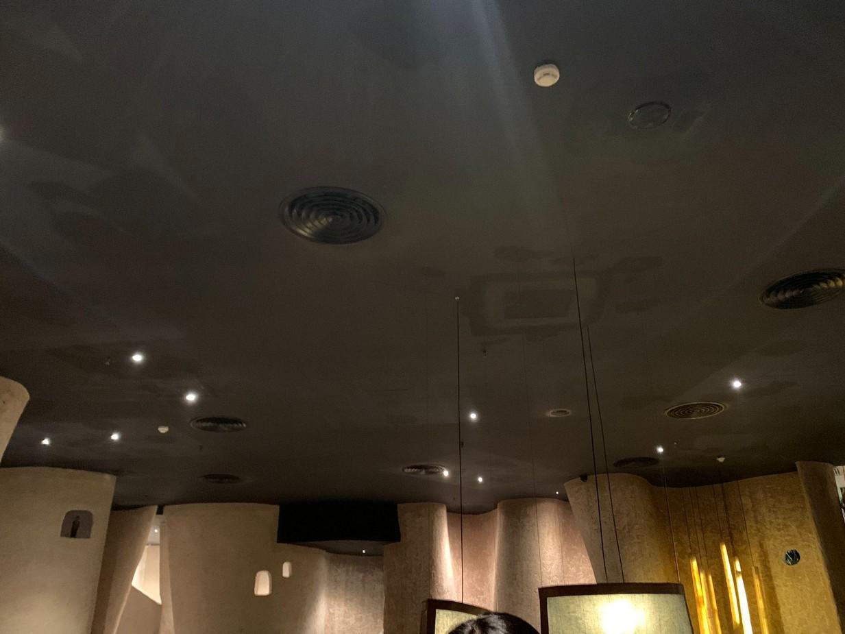 Mặt bằng chia rõ ràng 2 khu bàn ăn và chế biến riêng biệt, tạo cảm giác yên tĩnh cho các cảm nhận ăn uống ở khu vực bàn cho khách. Bên cạnh đó, dù đã ở bên trong trung tâm thương mại nhưng không gian nhà hàng được xây dựng tách biệt với lớp tường uốn lượn chạm trần, bối cảnh ôm ấp người trải nghiệm tránh xa ồn ào bên ngoài. Không gian ăn và chế biến cũng có tương phản rõ rệt trong cách xây dựng hình tượng, một bên mềm dịu nhẹ nhàng, một bên cần tính chính xác để thao tác chế biến.