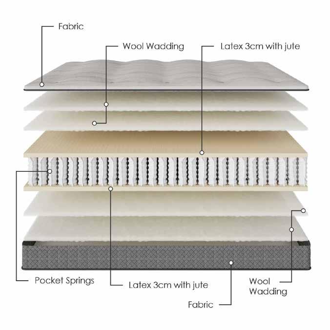 Medium-to-soft feel, anatomical, handmade with Individual pocket coils offering a personalised sleeping experience with a philosophy of a holistic body support, adapting to the body’s natural movement with zero-pressure points or oscillating discomfort. Encourages free air flow, regulates humidity and body temperature, with state of the art insulation, anti-mould, antibacterial and hypoallergenic properties. Designed to fit the Mediterranean microclimate regarding temperatures and humidity.