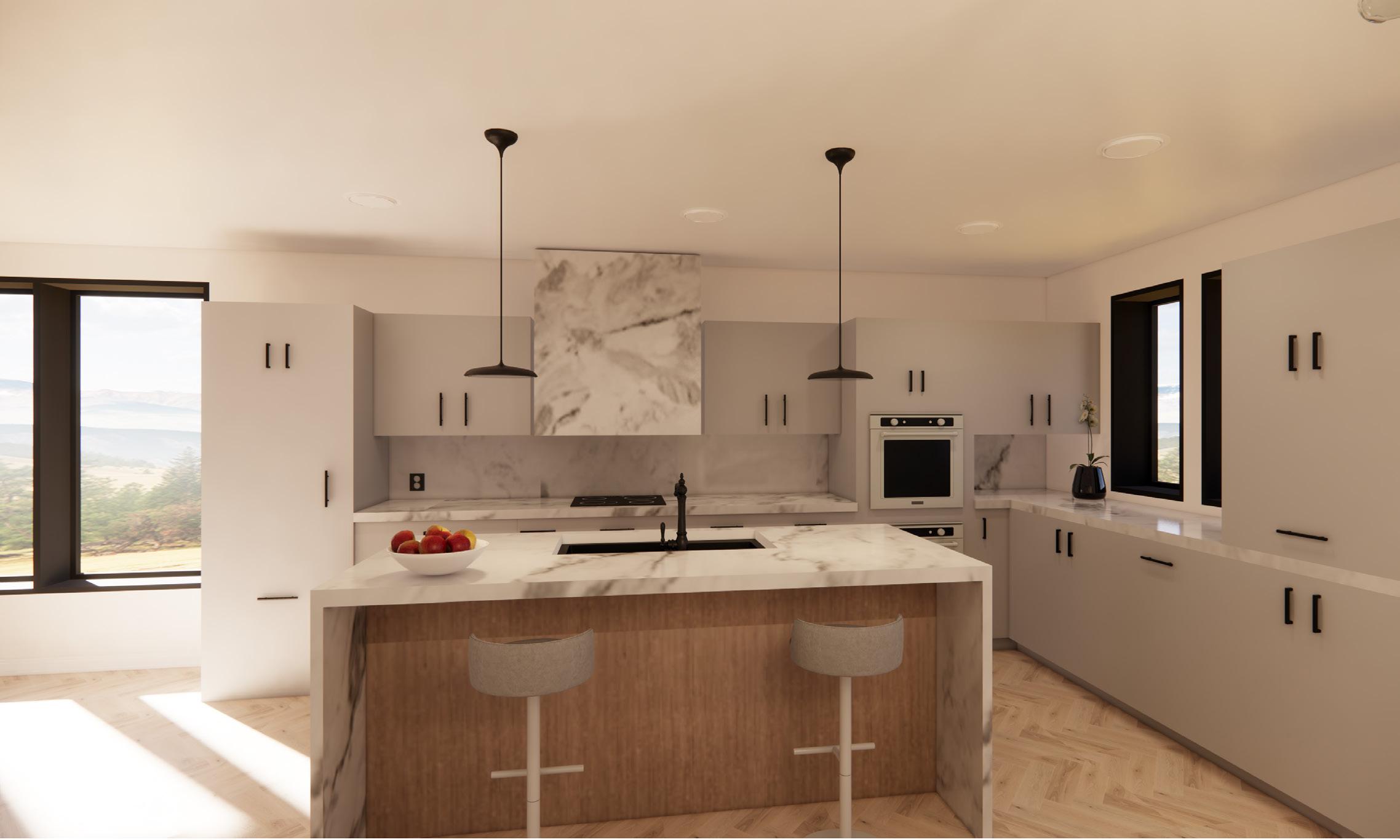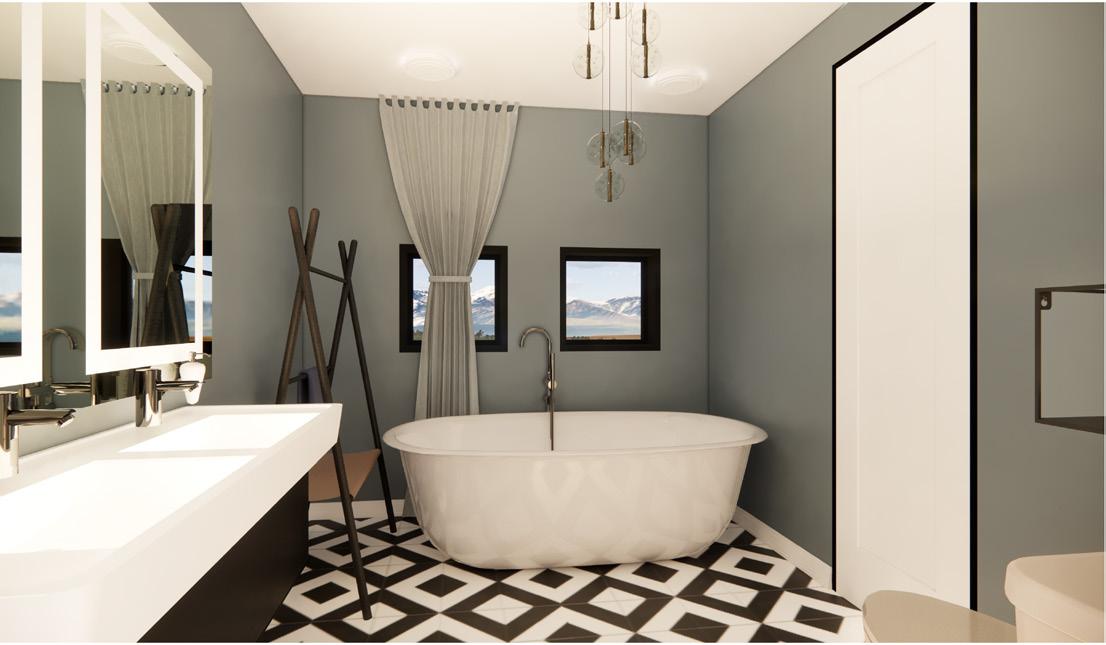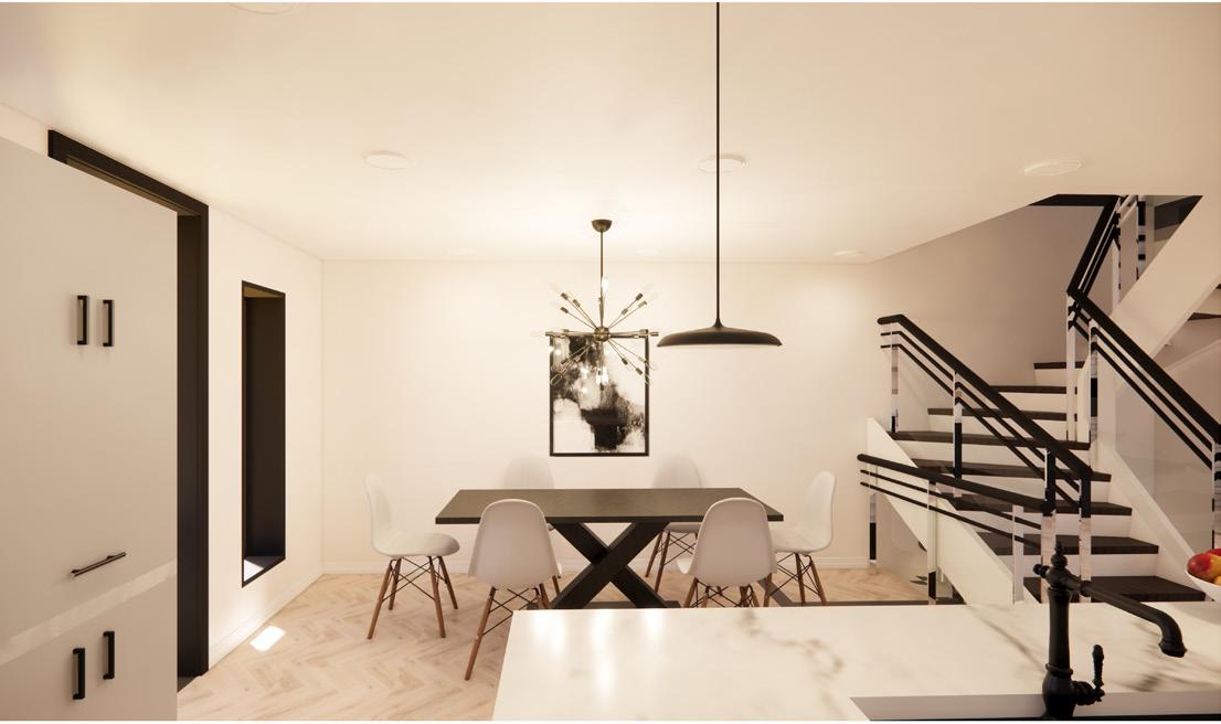 The concept of this home is to reflect a timeless yet upbeat, comfortable atmosphere. A young couple with children will function well in this modern-style home. The theme of this house is timeless modern. The house consists of many straight edges with a touch of natural elements to warm up the space. The open floor plan allows for a linear path of light, air and feng shui to flow through and bring the outdoors in. With the use of windows, wooden materials, natural greenery, and glass doors and stairs these elements will help enhance the home by making it feel larger and more spacious.