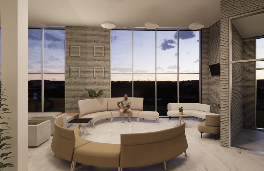 low maintenance. Teknion facility will consist of tons of natural light which will be especially beneficial for the live greenery wall; this will encourage clean air and will help with keeping the building as eco-friendly as possible. The use of glass sliding doors will soften the feeling of isolation by allowing individuals to see past their own line of sight. High gloss white finishes will provide a sanitary background that does not distract or take away from the furniture. The flexible arrangements of the Teknion showroom will create a visually stimulating maze that promotes cleanliness and yearround functionality; pandemic or not. The possibility of furniture configurations will feel endless and ideally inspire customers to mix and match when creating their own space.