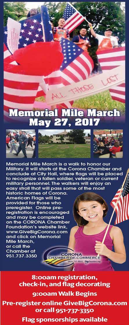 The CORONA Chamber Foundation proudly offers various events for the community to participate in. Every May, we host the Memorial Mile March; In September is the 9/11 Remembrance and every Saturday, is the Cars and Coffee program. Through the various donations the Chamber Foundation assists in presenting the Annual Salute to the Military in November. For more information, email Foundation@MyChamber.org or call the Chamber at 951 CHAMBER SALUTE TO THE MILITARY Funded by the generous donations from Cars and Coffee Thursday November 10, 2022 6:30AM—8:30AM Register at: Bit.ly/GMCNov2022