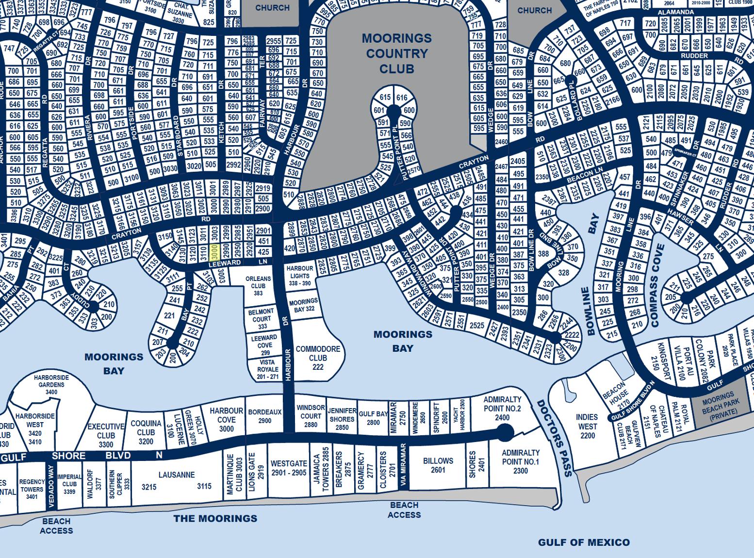 • Situated between Coquina Sands to the south and Park Shore to the north, The Moorings neighborhood is renowned for its serene ambiance and convenient access to the Gulf and beaches, offering residents a mature and tranquil environment.