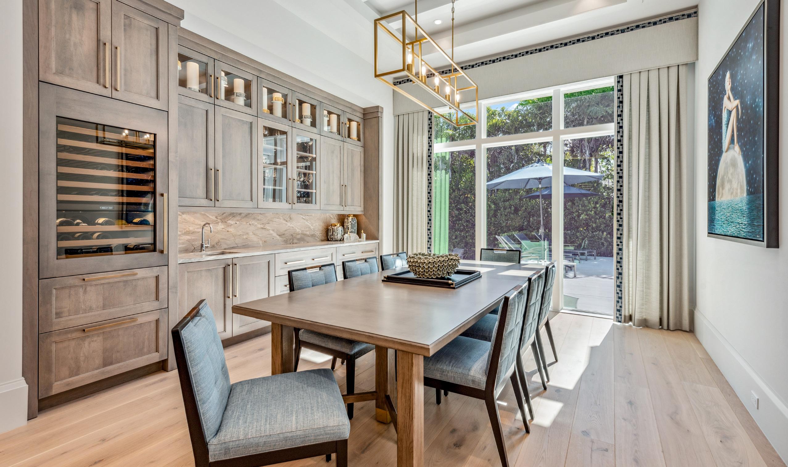 • Custom bar in dining room features Sub-Zero wine fridge, and two beverage drawers