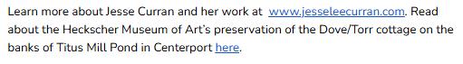 Her recent book project, a collection of poems and essays, turns to the North Shore of Long Island and explores the metaphorical resonance of local landmarks, using as her centerpiece landscapes and other works by Arthur Dove and Helen Torr, mid-20th Century artists who often used its geography as inspiration for art.