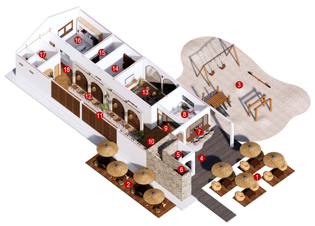 Carrying the concept of Harmonizing Nature and Modernity. Inspired by the owner’s vision of creating an iconic beach club café that has the potential to become one of the top spots on Pasir Padi Beach, we approached the architectural design by integrating the location. We combined modern tropical architecture with a coastal ambiance to create a visual contrast that still harmonizes with the natural surroundings. The interior elements feature a light-toned color palette, a tropical-coastal ambiance, dominant wooden materials, and a tranquil atmosphere.