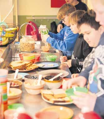 De kinderen lopen ’s ochtends met hun klas naar het ontbijt-buffet, waar ze mogen uitkiezen