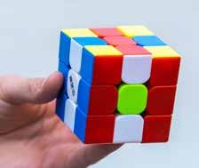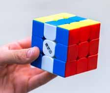 filmpjes, vooral van CubeHead. Om sneller te worden, moet ik 27 algoritmen uit mijn hoofd leren. Een algoritme is een set draaibewegingen in een bepaalde volgorde.”