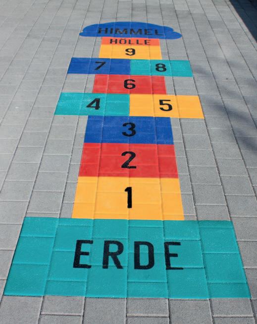 Schulhausplätze können mit Buchstaben oder Zahlen pädagogisch wertvoll gestaltet werden. Das ist eine alternative Art des Lernens und bringt Bewegung und Spass.