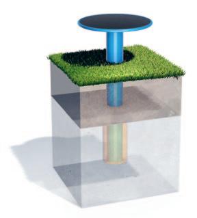 Zur Befestigung der Flanschsäulen gibt es zwei Möglichkeiten: Entweder zum Einbetonieren über ein Köcherfundament oder zum Aufdübeln mittels Flanschmontage. In beiden Fällen sind die Fundamentabmessungen identisch. Die Säule hat einen Durchmesser von 168 mm und ist dank einer Feuerverzinkung mit nachfolgender Farbpulverbeschichtung dauerhaft vor Korrosion geschützt. An jeder Standsäule befindet sich eine präzise und dauerhafte Markierung, die die ideale Höhe der Spielebene anzeigt. Diese Markierung dient als Referenzpunkt während der Installation sowie für zukünftige Wartungsarbeiten.