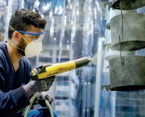 Dieser Begriff umfasst alle Verfahren, bei denen das Produkt mit einem pulverförmigen Beschichtungsmaterial versehen wird. Da dieses Material lösungsmittelfrei ist, zeichnet sich dieses Verfahren als besonders umweltverträglich aus. Die zu beschichtenden Teile werden mit einem Power & Free System automatisch durch den Einbrennofen transportiert.