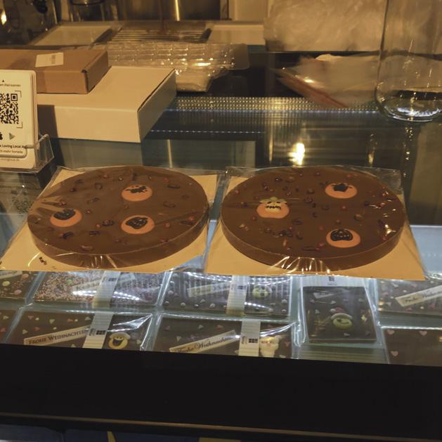 Die Kühltheke sieht echt verlockend aus, Raoul hat schon mal zwei Schokis ausprobiert – die ersten runden im Laden überhaupt, hier mit Halloween-Deko!