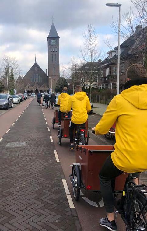 mende vraag van ouders. Hierdoor groeit het team ook snel. ‘We zijn te herkennen aan onze bakfiets zonder motor én een gele regenjas bij slecht weer. We gaan door weer en wind, en moeten net zo hard trappen als de kinderen. We maken er soms een wedstrijdje van, hierdoor enthousiasmeren we de kinderen om te bewegen. ‘De begeleider fietst voorop en de kinderen vanaf 7 jaar gaan zelf op ‘wieltjes’ mee. Op de fiets, step of skates, dat maakt niet uit. Als ze al maar lekker hun energie kwijt kunnen tijdens de rit van school naar de BSO.’