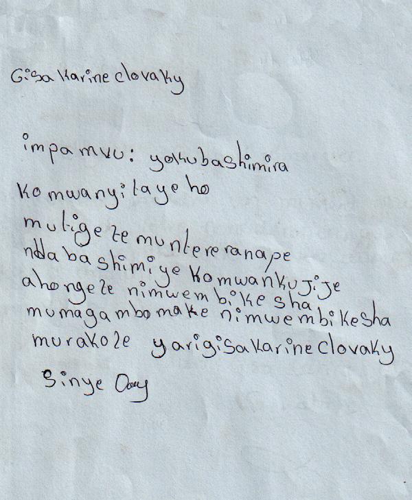 Ik zit nu in het vierde jaar, dus ik zou blij en dankbaar zijn als ik mijn school zou kunnen afmaken dankzij jullie hulp. Ik hou van jullie allemaal, leden van Vriendenkring Rwanda.